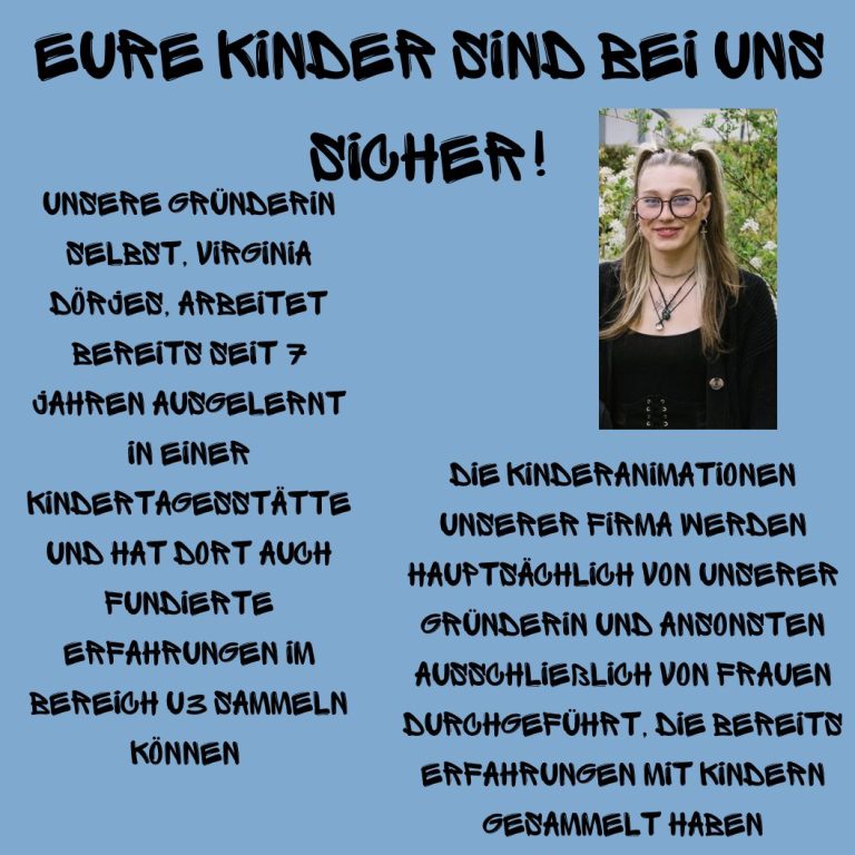 Kids Corner by Virginia ist spezialisiert auf Kinderanimation, aber mit pädagogischem Hintergrundwissen. Wir möchten Ihnen dabei helfen auf Hochzeiten oder anderen, für Kinder eher ungeeigneten Veranstaltungen, ein Platz nur für die Kinder zu schaffen. Sie sollen sich dort wohlfühlen können und sich aufgehoben und abgeholt fühlen. Es gibt für uns alle nichts Schlimmeres, als das Kind vor dem Tablet zu parken. Des Weiteren versuchen wir auch gerade Kindern mit wenig Selbstbewusstsein oder Anschlussschwierigkeiten durch Schminke und gekonnte Teamspiele wieder neuen Mut zu schenken.